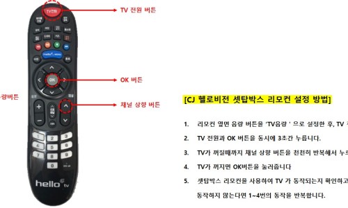 CJ 헬로비전 셋톱박스 통합 리모컨 설정 방법